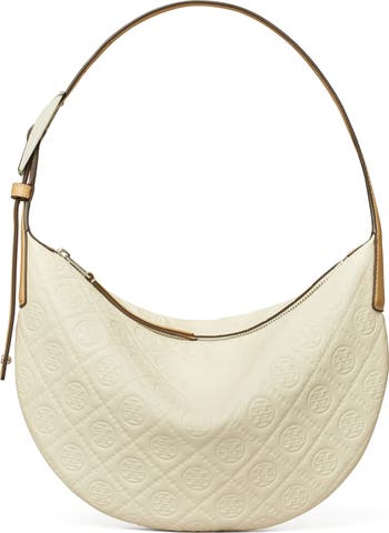 Monogram jacquard and pebbled leather add visual intrigue to a crescent-shaped shoulder bag fitted with an adjustable strap for comfortable wear.
