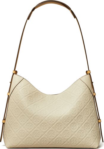 Tory's signature stacked-T monogram ensconced between bead-style gridding creates tile-inspired artistry across this pebble leather messenger bag featuring a roomy profile and adjustable shoulder strap.