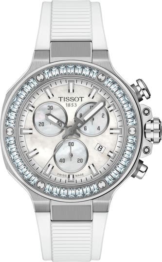 The brand's passion for motor sports is channeled down a more elegant road, one paved in mother-of-pearl and baguette-cut ceramic stones in the making of this T-Race chronograph that will take you from zero to spectacular in no time at all.