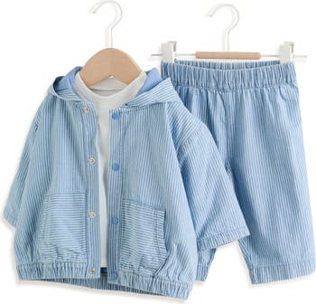 A cotton-lined stripe jacket, coordinating pants and a classic tee come together in an easygoing three-piece set that's perfect for baby's everyday outing.