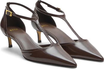 A pointy toe and kitten heel balance a striking pump designed in a T-strap silhouette for contemporary allure.