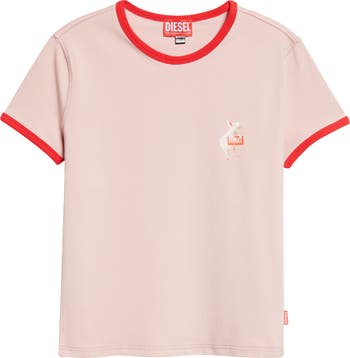 Echoing the surreal, creature‑coded visuals of DIESEL's spring ’26 collection, this retro ringer T-shirt in form‑hugging jersey stars a fiercely cute mascot in velvety flocking.