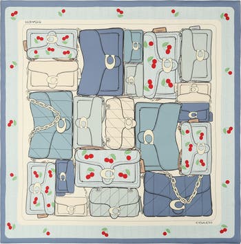 Illustrated Tabby bags and bright cherry motifs bring whimsical charm to this silk square scarf that can be worn around the neck or tied to your favorite purse.