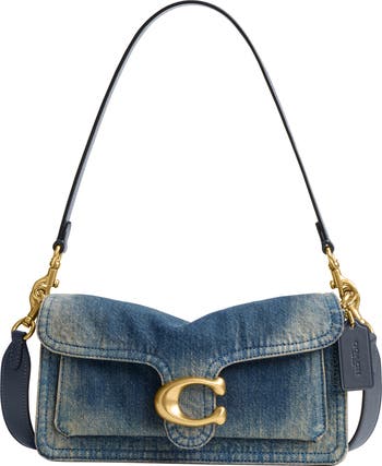 Brushed hardware and smooth leather trims highlight the distressed denim exterior of a shoulder bag fashioned with a divided interior and detachable straps for versatile styling.