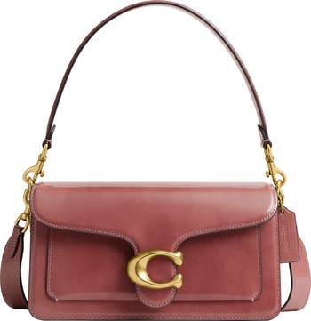 A detachable top handle and adjustable strap lend versatility to a glossy leather bag styled with a divided interior and iconic hardware for signature appeal.