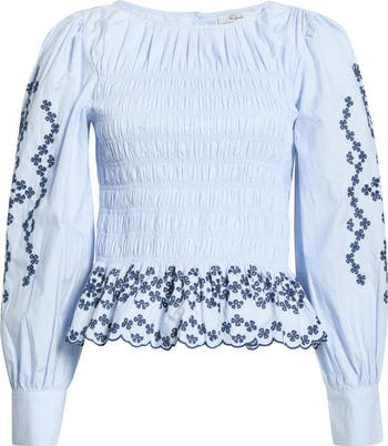 Tap into your free-spirited side in this smocked cotton top framed by an embroidered-eyelet peplum and blouson sleeves.