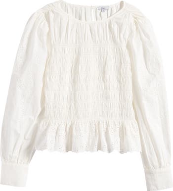 Tap into your free-spirited side in this smocked cotton top framed by an embroidered-eyelet peplum and blouson sleeves.