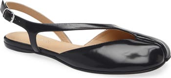 Merging a fifteenth-century Japanese tabi sock and a classic slingback, this split-toe flat is both avant-garde and traditional. Signature touches include a white basting stitch at the back and numerical debossing along the sole.