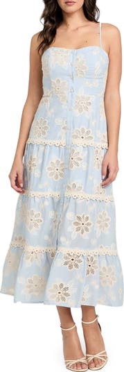 Crochet-inspired flowers and lace trim sweeten the retro charm of this button-front sundress balancing a fitted bodice with a tiered skirt.