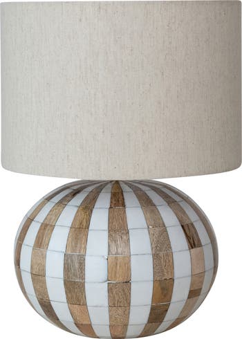 - A rounded table lamp with a natural mango wood base, accented by inlaid resin stripes and topped with a soft cotton blend shade