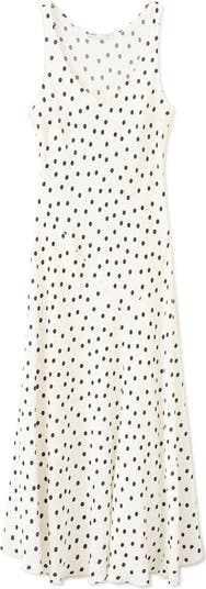 A subtle asymmetric hem adds a flash of modern allure to a sleeveless dress patterned in snappy polka dots.