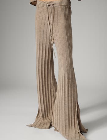 Linen-blend knit trousers, high waist and sweeping wide-leg silhouette, breathable drape and softly textured knit for sunlit days and resort-ready ease.