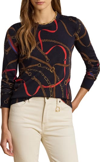 Bridles and reins with touches of metallic sheen wend their way around a fine-gauge crewneck sweater that's a must for equestriennes and fans.