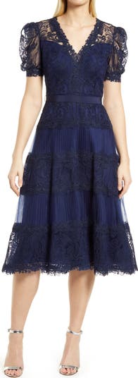 Panels of beautifully embroidered lace and sheer tulle add to the elegant movement and texture of a striking midi dress with puff sleeves and a plunge neck.