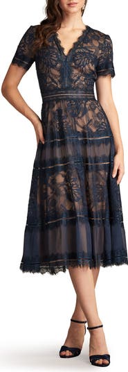 Lace and mesh collide to usher in an A-line dress with an elevated vision for the classic LBD—perfect for a candlelit dinner or night on the town.