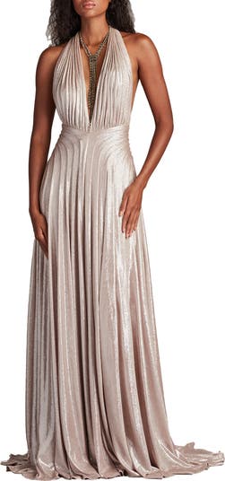 Flowing champagne pairs perfectly with a softly pleated gown simmered in shimmer and designed with a deeply dipped neckline and a showy open back.