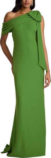 The night will be yours in this stunning gown designed with a beautiful neckline and bow that cascades gracefully across the shoulders. A floor-pooling hemline elevates the elegance of the truly dream-worthy look.