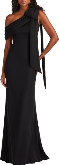 The night will be yours in this stunning gown designed with a beautiful neckline and bow that cascades gracefully across the shoulders. A floor-pooling hemline elevates the elegance of the truly dream-worthy look.