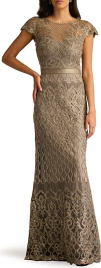 Intricately embroidered lace detailed with tonal sequins brings romantic texture and subtle shine to a floor-length gown with an illusion neckline. A ribbon at the waist accentuates the elegant, figure-skimming silhouette.
