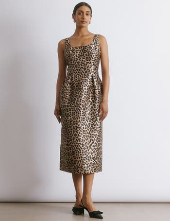 This elegant taffeta dress features a striking bold print that commands attention. Designed with a flattering fitted waist and a graceful tulip skirt, it enhances your silhouette while offering a sophisticated shape. Practical side pockets add convenience without compromising style, making this dress a perfect choice for both formal occasions and stylish daywear. Crafted to combine boldness with refinement, it delivers a confident and polished look.