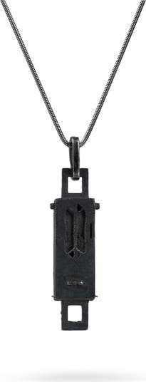 Sterling silver pendant features an industrial, geometric design with intricate cutouts and a modern, architectural aesthetic. Hanging from a Silver rope chain.