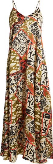 A mix of gorgeous prints creates vacation-ready style on this flowy maxi-length slipdress popped with handy pockets and made from touchable matte charmeuse.