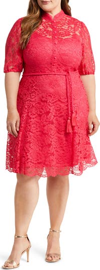 Pop into party season in an all-lace dress rendered in a raspberry hue and sweetly scalloped at the hem.