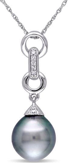 This graceful necklace features Tahitian drop platinum pearls adorned with round diamonds set in 10-karat white gold. This marvelous pendant is hung on a rope chain and is secured with a spring ring clasp.