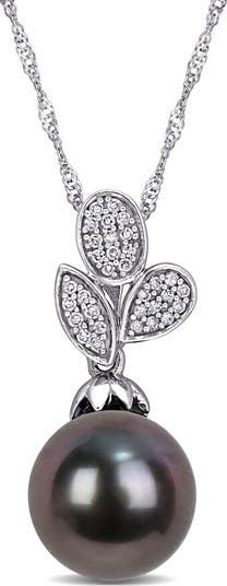 This pretty leaf drop necklace is crafted in 10-karat white gold. This stunning pendant with chain features a Tahitian cultured pearl and 32 round-cut gleaming diamonds rested above the pearl, that add dramatic elegance to this lovely design. A captivating design that you can keep close to your heart for a lifetime.