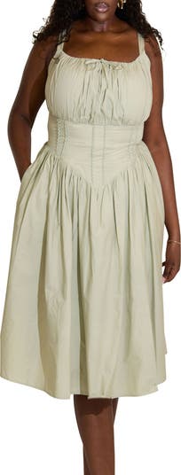 Designed for fuller-bust proportions, this cotton midi dress features a structured, bra-free bodice with internal boning and adjustable straps for a secure fit. Fitted through the bust and waist, the silhouette falls into a softly flared skirt with lace bodice detailing and functional side pockets.