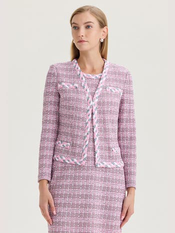 This tailored tweed knit jacket is accented with elegant braided trim for a refined yet feminine finish. Polished enough for desk to dinner styling and effortless for brunch plans, it layers beautifully over the matching dress or stands alone with crisp separates. A versatile spring to summer piece that blends structure, comfort, and timeless charm.