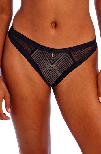 Geometric lace brings fresh style to these Brazilian-cut panties designed with striped elastic edges that disappear under your clothing.