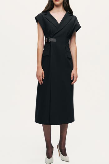 Step into sleek sophistication with this tailored buckle-wrap midi dress. Featuring a sharp V-neckline with lapel detailing and structured cap sleeves, the design exudes polished elegance. The wrap-style front cinches with a side D-ring buckle, adding a refined twist to its classic silhouette. Flap hip pockets lend utility-inspired edge, while a concealed back zip ensures a seamless finish. Ideal for work-to-dinner transitions or elevated daywear.