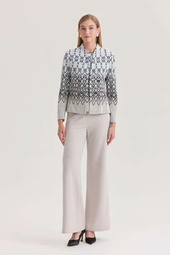Sophisticated and structured, this diamond jacquard knit jacket is designed for polished, professional wear. The modified mandarin collar and hook-and-eye closure at the waist create a refined, tailored silhouette, accentuated by mid-bodice darts for a flattering fit. Finished with decorative signature Ming Wang buttons, it’s the perfect layer to elevate your workday wardrobe. Tailored Fit: This refined silhouette features a structured design that offers a more fitted look in the arms, chest, and waist. Flattering dart lines below the chest create a contoured effect. If you're between two sizes, we recommend ordering one size larger for an improved fit.