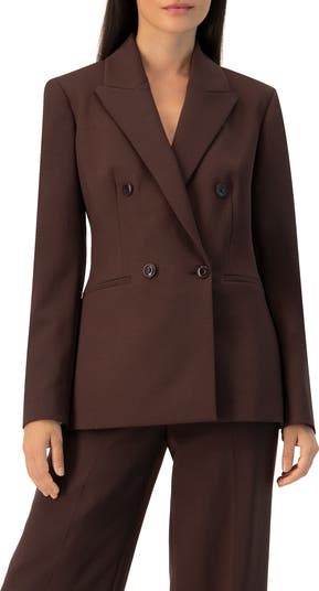 Tailored blazer featuring a lapel, pockets, and double-breasted design.
