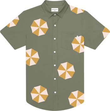 Colorful umbrellas bring beachy vibes to this waterproof button-up that has UPF protection and four-way stretch to keep you moving comfortably.