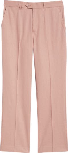 A subtly rumpled blend of linen and cotton in a blushing mauve makes a warm-weather favorite of tailored trousers designed with flat-front construction and a smart, straight-leg profile.