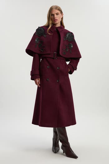 Make an unforgettable entrance in this architectural Karen Millen coat that combines timeless tailoring with artistic flair. The distinctive cape overlay adorned with floral embroidery creates a dramatic silhouette that commands attention at any formal gathering.