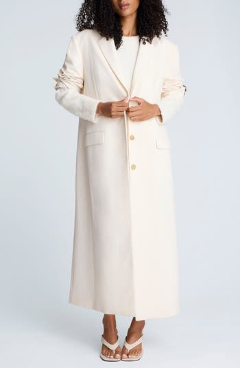 An elongated silhouette dials up the drama of an otherwise classically tailored coat offered in a snowy shade.