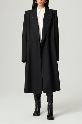 Elegant and structured, this longline coat is designed in a sharp tailored silhouette with strong shoulders and peak lapels for a commanding presence. The double-breasted front features covered buttons and discreet side pockets for a clean finish. Falling below the knee with a center-back vent for movement, it’s fully lined for comfort and ideal for layering over both formal and casual looks.