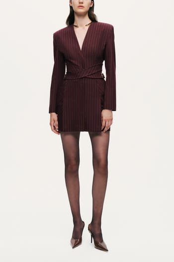 Sleek and structured, this tailored mini dress is crafted from refined pinstripe suiting for a sharp, modern look. The plunging V-neckline and structured shoulders create an elongated silhouette, while the fixed wrap waist with side buckle tabs defines the shape with a polished edge. Designed in a clean mini length with a straight hem, it closes with a concealed back zip for a smooth finish. Unlined for a lightweight feel, it’s a statement piece that pairs effortlessly with heels or knee-high boots for confident day-to-night styling.