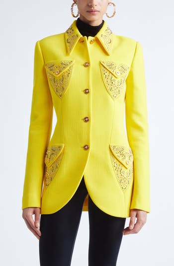 The ornately studded dagger collar seen through the label's fall '25 collection puts a '70 slant on this runway-featured jacket cut from lemon-hued virgin-wool crepe. Medallion-style Medusa-head buttons add a house-signature finish on the look