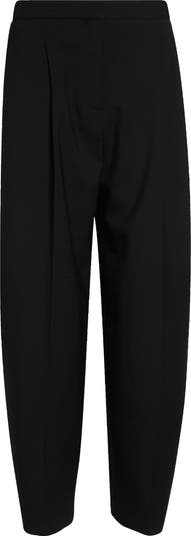 These rounded pants cut from stretch-enhanced wool gabardine achieve sculptural precision with single pleats and barrel legs that taper to narrowed cuffs.