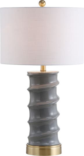 Commanding and architectural, this table lamp offers a calculated vision of contemporary design. A glazed ceramic column in a high-shine finish is segmented into gently curving ridges, finished with gold hardware and an attractive linen drum shade. Style extends all the way to the plug, with a 60" silk-wrapped cord.