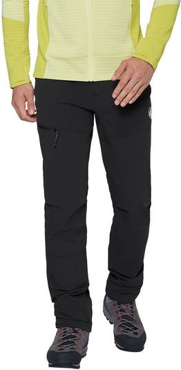 We head into the mountains year-round, and the Taiss SO Pant keeps pace no matter the objective. From alpine climbs to icy mountaineering routes, these pants balance freedom of movement with the toughness needed for rock, snow, and mixed terrain. Mammut built them to feel natural while moving fast and deliberate when things get steep. The robust softshell double-weave fabric resists abrasion while remaining breathable and wind-repellent, finished with a PFC-free water-repellent treatment. Stretch throughout the fabric supports dynamic movement, while the externally adjustable waistband fine-tunes fit. Harness-compatible zip pockets keep essentials secure, and the adjustable, asymmetrical hems with boot hooks deliver a streamlined fit over mountaineering boots for precise foot placements.
