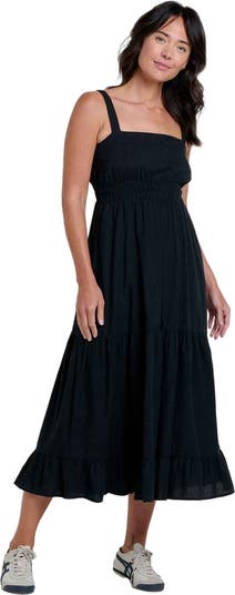 - Tiered silhouette, square neck, bra-friendly adjustable straps, smocked waistband, midi length, 50 inch length