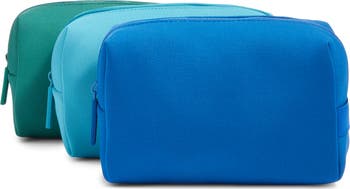 Keep things neat and tidy whether at home on your own vanity or in your suitcase while traveling with this trio of neoprene pouches that zip closed to secure your stuff.
