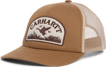 A twill embroidered patch featuring waterfowl taking off fronts this five-panel trucker hat with a cotton front and breathable mesh comfortably completing the style.