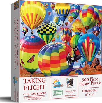 Dive into the realm of creativity with the Taking Flight 500 piece jigsaw puzzle from SunsOut Puzzles. Perfect for avid puzzle enthusiasts and those seeking a blend of art and relaxation, this engaging product showcases a mesmerizing scene of colorful hot air balloons, brought to life by renowned artist Lori Schory. Each SunsOut puzzle is environmentally friendly and crafted in the USA with high-quality, recycled cardboard and soy-based inks, boasting a finished size of 18" x 24". Enjoy a remarkable assembly experience as each precision-cut, interlocking piece fits perfectly within the puzzle, bringing about a satisfying and seamless construction. Rest assured with SunsOut’s worry-free guarantee offering hassle-free replacements for any missing or damaged pieces. By choosing SunsOut, you're not only indulging in a pastime but supporting a woman-owned business that honors art, excellence, and environmental responsibility. Whether given as a gift or used as a personal project, the Taking Flight puzzle provides a sense of achievement and a beautiful piece of art to admire. Experience the joy of puzzle-solving and immerse yourself in the captivating world of SunsOut Puzzles.