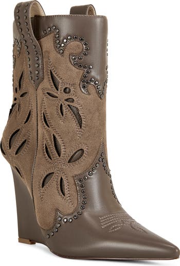 Placed studs, contrast stitching and patterned cutouts define the Western-inspired vibe of this pointed-toe bootie lifted by a slender wedge.
